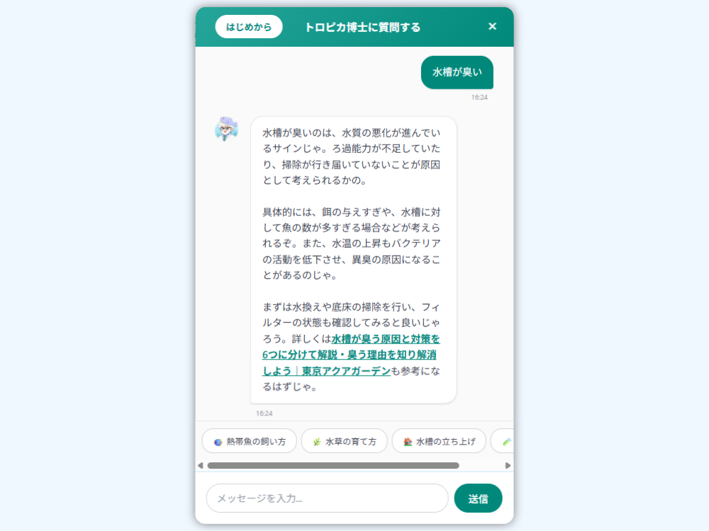 熱帯魚の飼育や水槽管理についてのご質問は、画面右下に表示されているAIチャットボット「トロピカ博士」へお声がけください。